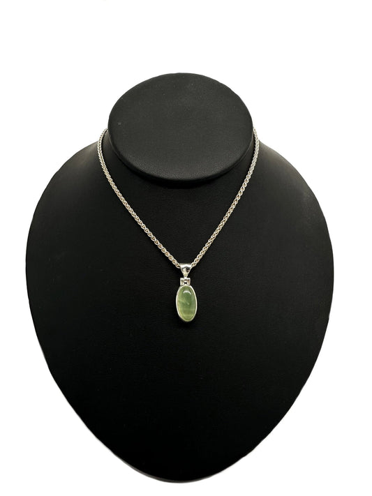 Prehnite is a pale green to yellow-green mineral that forms in the veins and cavities of volcanic rock, particularly basalts, and occasionally in granitic environments. Known for its soft, almost ethereal glow, prehnite is typically translucent, with rare examples displaying partial transparency or cat’s eye optical effects.
